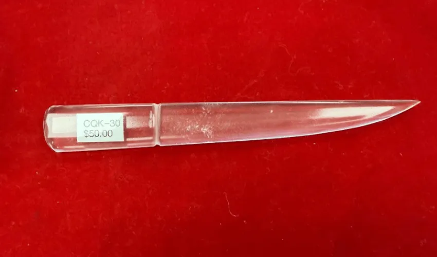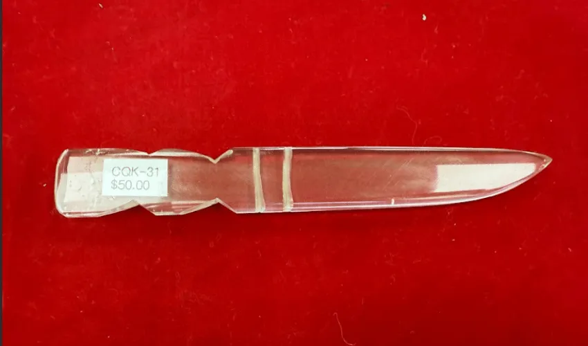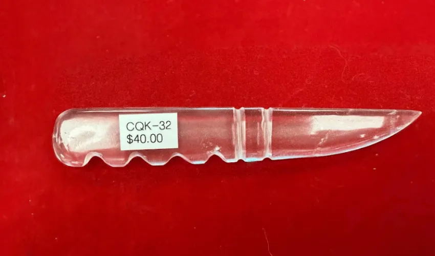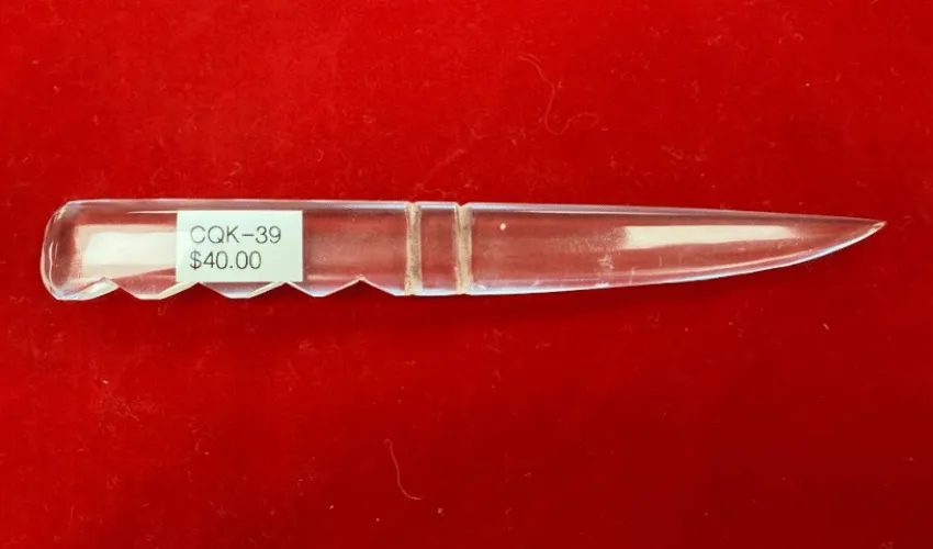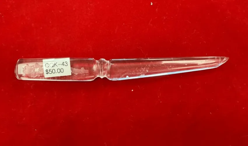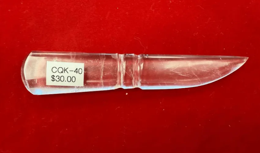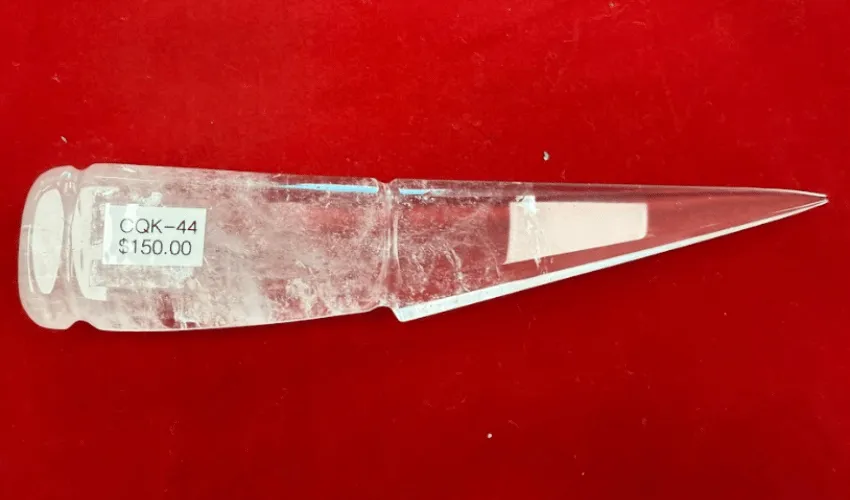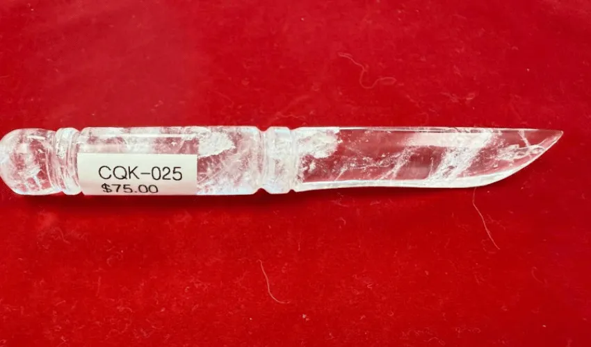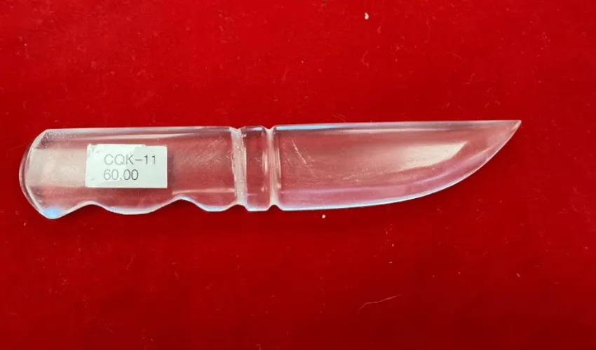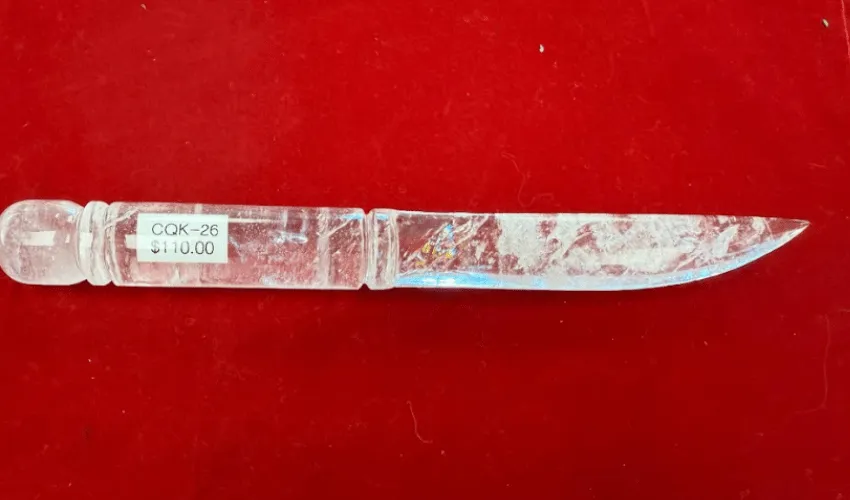 Crystal knives are traditionally used for energetic cutting, separation, and clearing. In energy work, they are associated with removing unwanted energetic attachments or blockages. Their defined shape allows for precise application during cleansing or balancing practices. Each knife differs in crystal type, length, and form, and is handled with care due to its delicate structure.